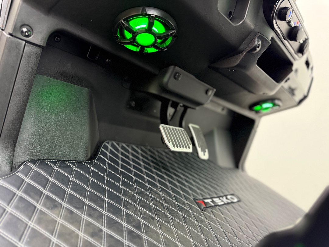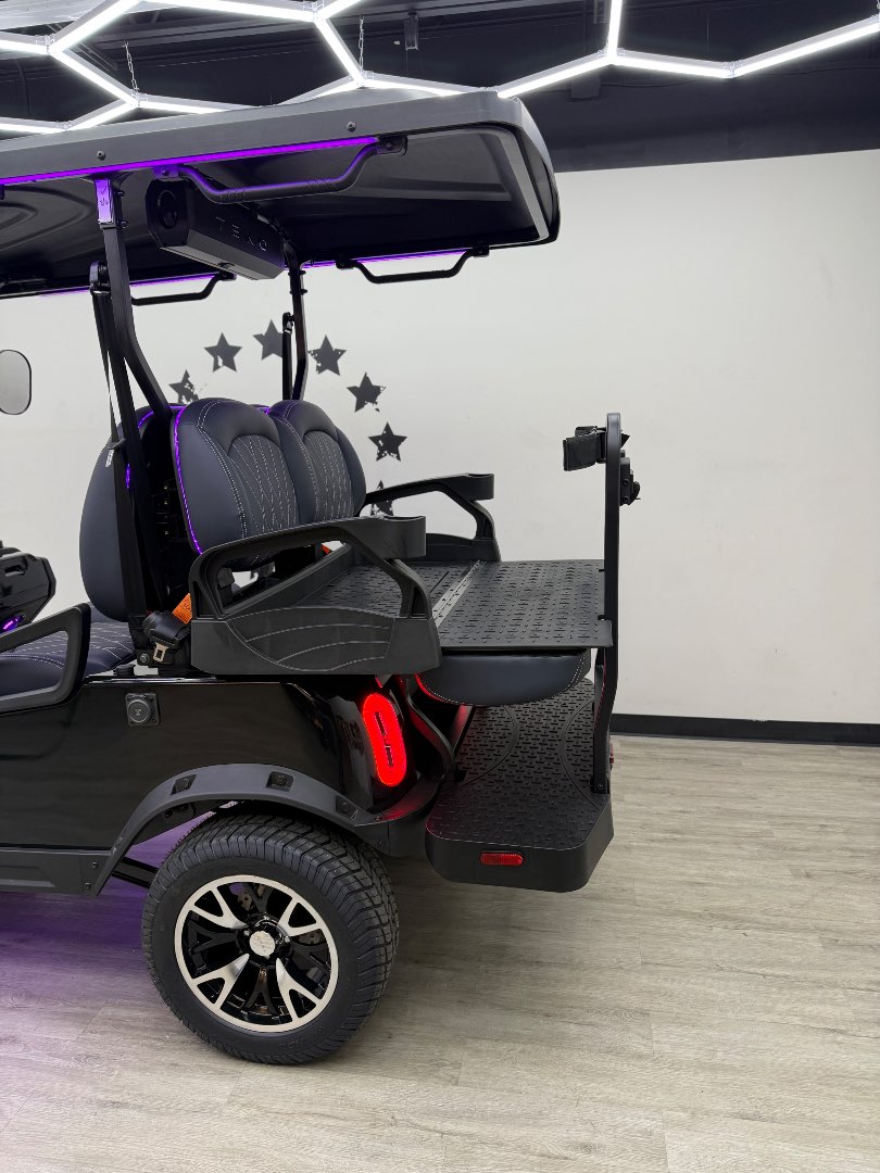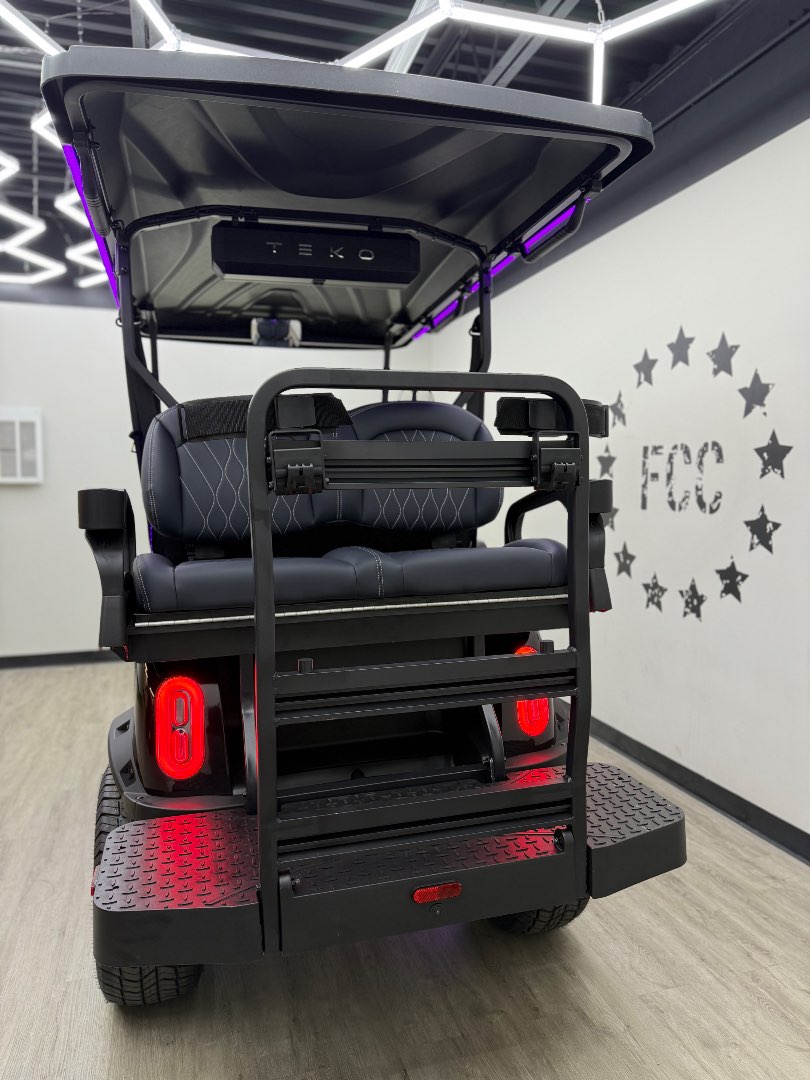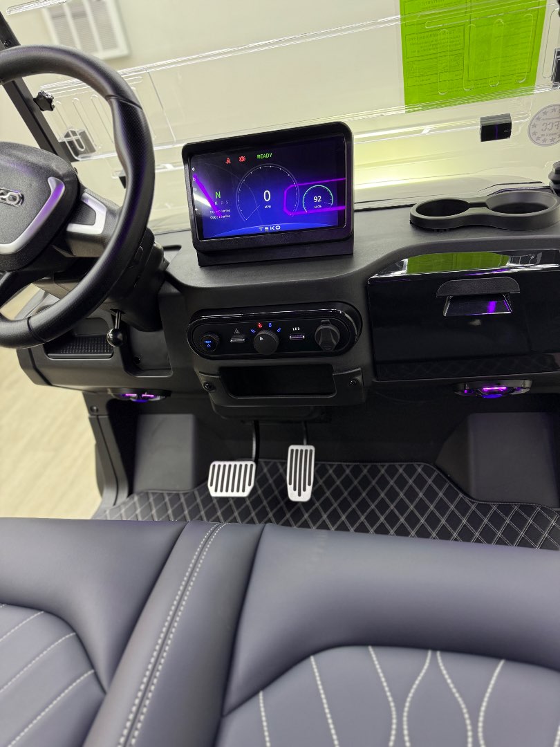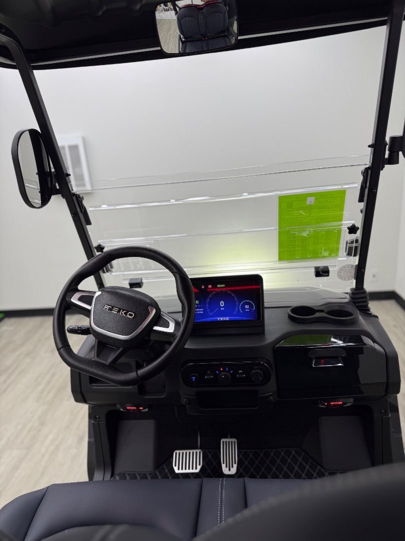 The TEKO Turbo is designed for both performance and comfort, featuring advanced safety and luxury amenities like a backup camera, Bluetooth audio, and ambient LED lighting, making it a top choice for electric golf carts.