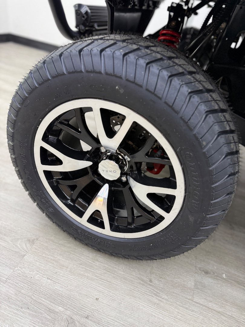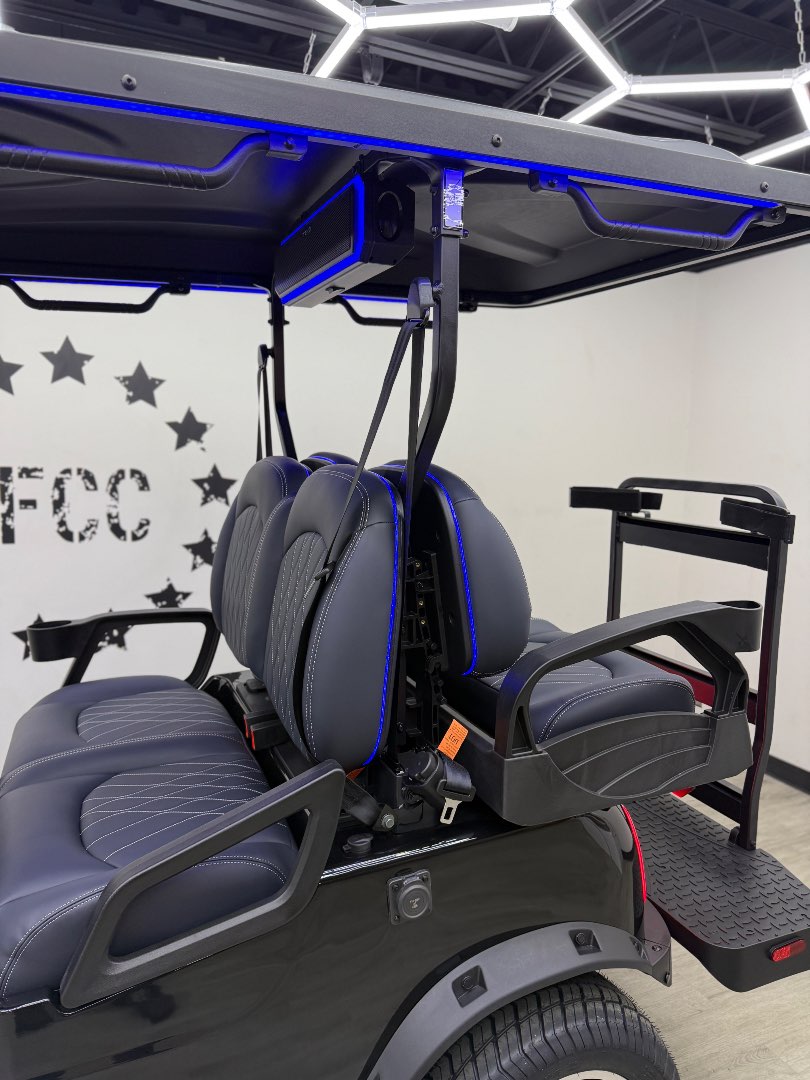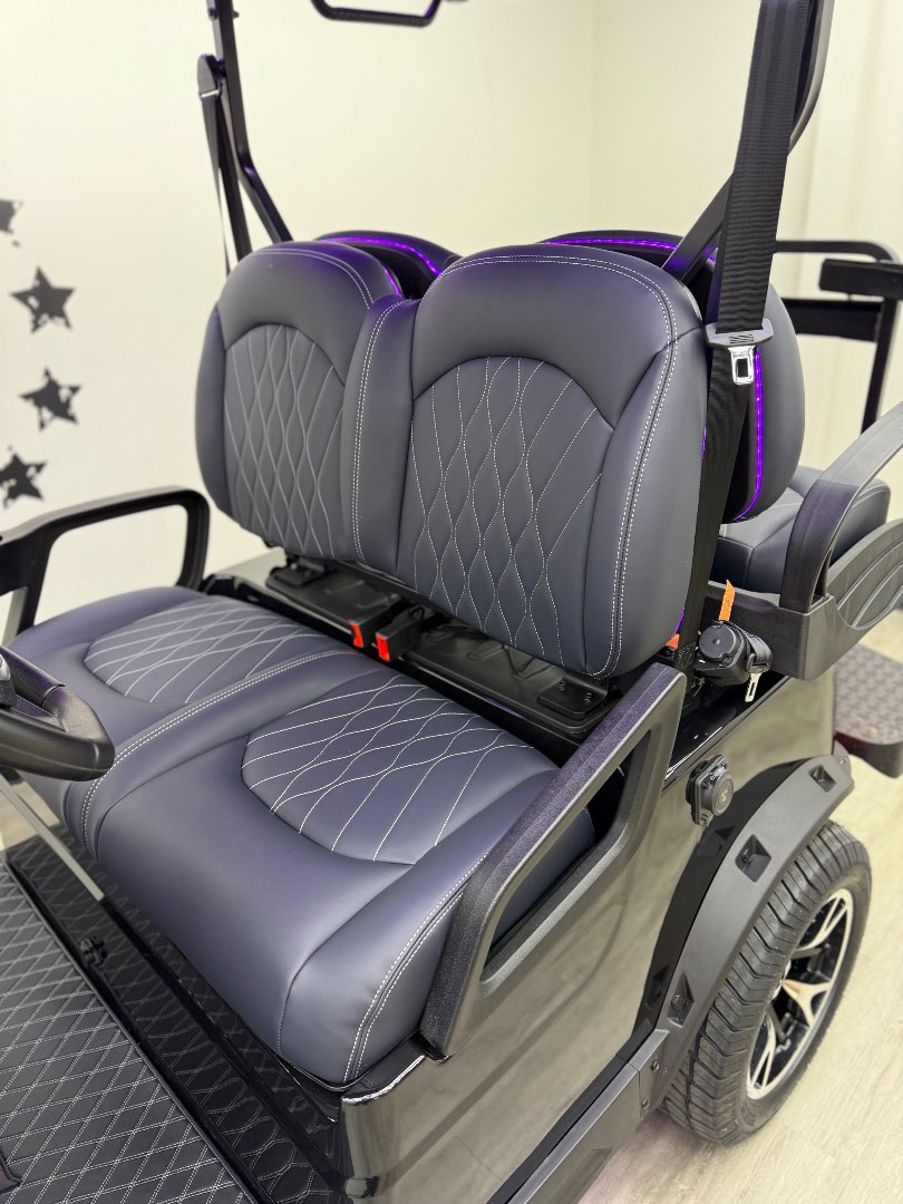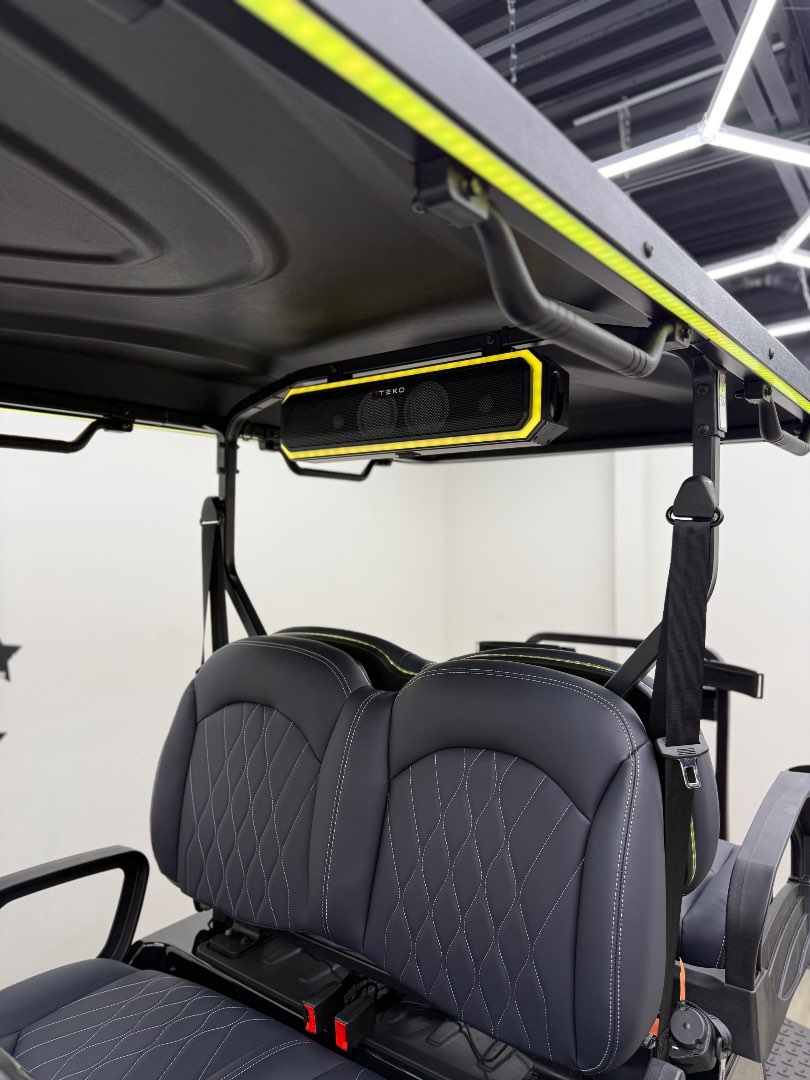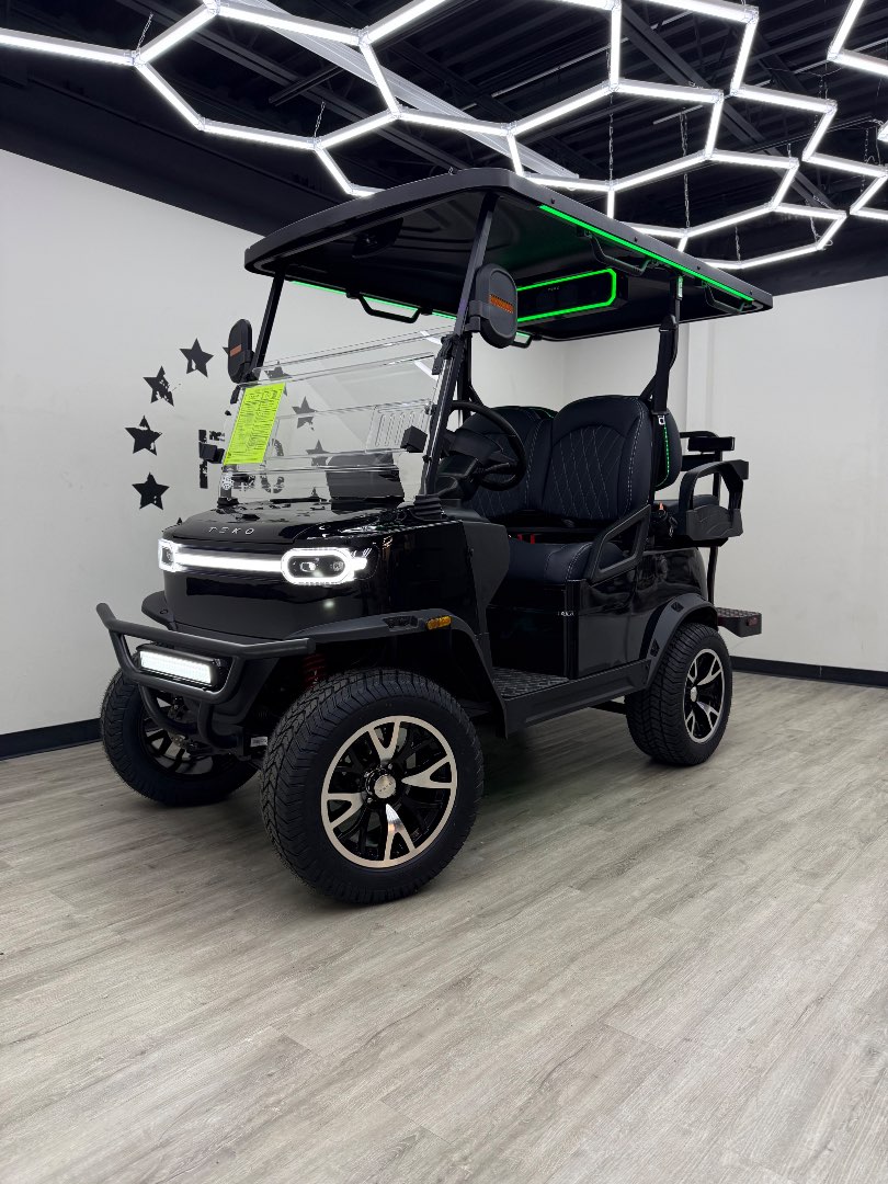 The TEKO Turbo is designed for both performance and comfort, featuring advanced safety and luxury amenities like a backup camera, Bluetooth audio, and ambient LED lighting, making it a top choice for electric golf carts.